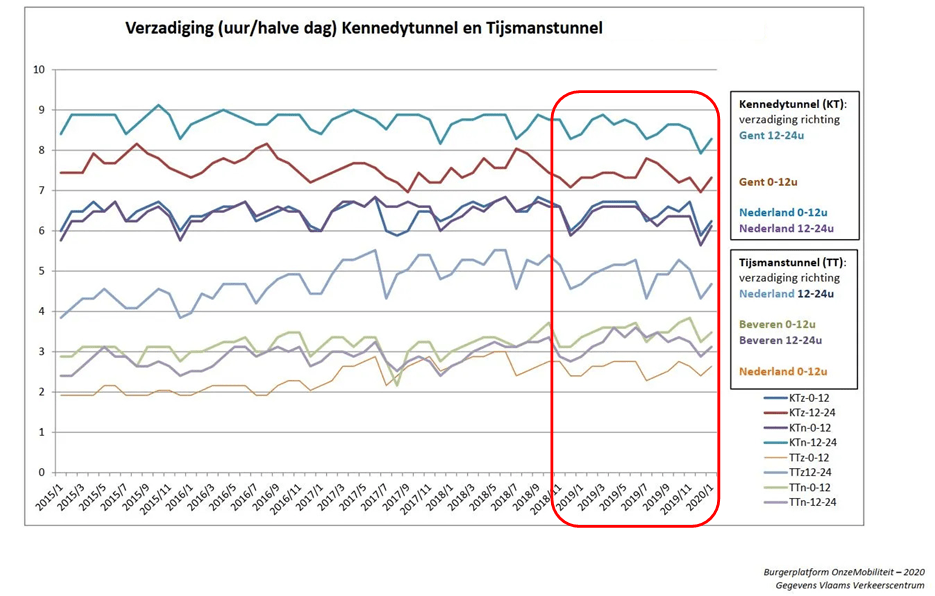 VERGELIJK DE 4 CURVES VAN DE TIJSMANSTUNNEL (LIEFKENSHOEKTUNNEL) MET DIE VAN DE KENNEDYTUNNEL VOOR 2019 TOT JAN 2020:
